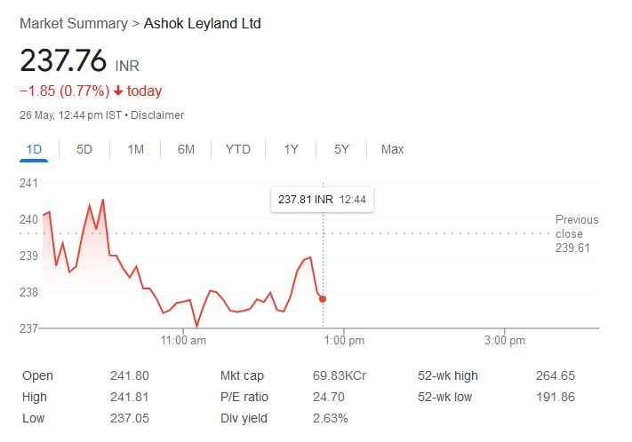 Ashok Leyland Share: अशोक लेलैंड लिमिटेड के शेयरों ने सोमवार की सुबह तेज शुरुआत की। स्टॉक ने BSE पर 243.15 रुपये के स्तर पर ओपनिंग की, जबकि शुक्रवार को यह 239.60 रुपये पर बंद हुआ था। इस तेजी की वजह कंपनी की मजबूत तिमाही नतीजे और बोनस शेयर का ऐलान है।