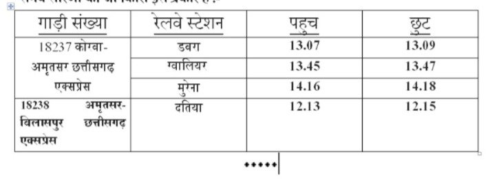 वीरांगना लक्ष्मीबाई (झाँसी) रेल मण्डल के अंतर्गत चार रेलवे स्टेशनों में छत्तीसगढ़ एक्सप्रेस की समय सारणी में आंशिक परिवर्तन ।