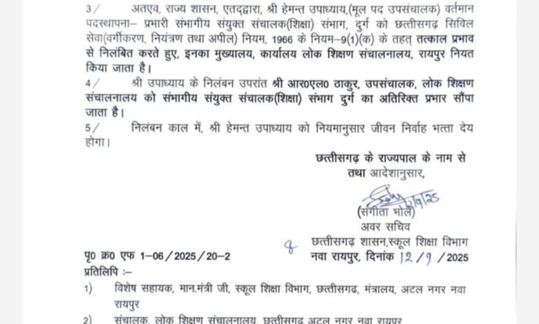 प्रभारी संभागीय संयुक्त संचालक शिक्षा दुर्ग हेमंत उपाध्याय गम्भीर अनियमितता में निलंबित