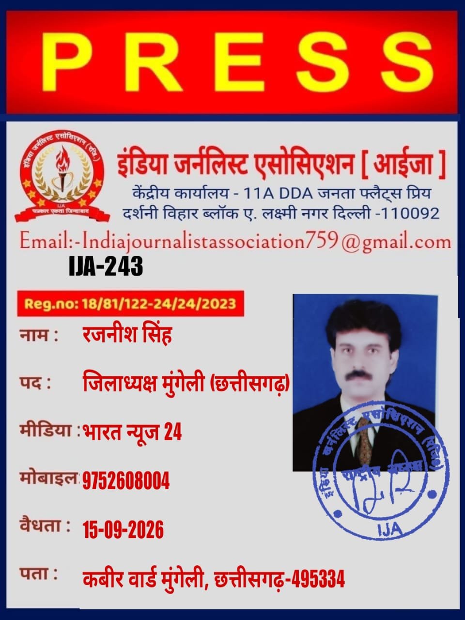 मुंगेली इंडिया जर्नलिस्ट एसोसिएशन रजि.(आईजा) के सभी वरिष्ठ पदाधिकारियों एवं वरिष्ठ पत्रकार साथियों को सादर पूर्वक अवगत कराया गया ,आईजा के राष्ट्रीय अध्यक्ष धनंजय पांडे जी के निर्देशानुसार प्रदेश अध्यक्ष मुरारी लाल रैदास जी और प्रदेश मुख्य संयोजक सूरज यादव जी के प्रबल संस्तुति पर रजनीश सिंह जी को सर्व सहमति से संगठन का छत्तीसगढ़ प्रदेश के मुंगेली जिले के लिए जिला अध्यक्ष के पद पर स्थाई रूप से मनोनीत कर दिया गया है, रजनीश सिंह जी अभी वर्तमान में इलेक्ट्रॉनिक मिडिया MKN NEWS चैनल, ANB NEWS, BHARAT NEWS 24 चैनल में मुंगेली जिले से ब्यूरो संवाददाता के पद पर कार्यरत हैं।*