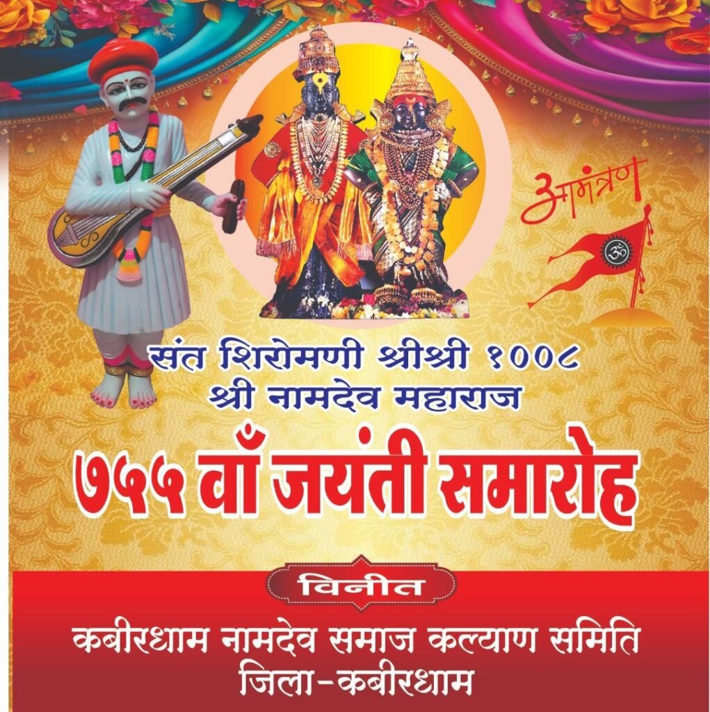 कबीरधाम नामदेव समाज कल्याण समिति जिले के समस्त नामदेव बंधुओ से अनुरोध करता है की श्री नामदेव महाराज जी की दिव्य शिक्षाओं और भक्ति परंपरा को स्मरण करें,और इस जयंती को श्रद्धा, सेवा एवं समर्पण के भाव से मनाएँ।