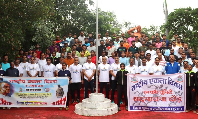 31 अक्टूबर 2025 राष्ट्रीय एकता दिवस के अवसर पर आज जिला कबीरधाम में सद्भावना दौड़ का सफल एवं भव्य आयोजन किया गया। कार्यक्रम पुलिस अधीक्षक श्री धर्मेंद्र सिंह के कुशल नेतृत्व एवं अतिरिक्त पुलिस अधीक्षक श्री पुष्पेंद्र बघेल तथा अतिरिक्त पुलिस अधीक्षक श्री पंकज पटेल के मार्गदर्शन में संपन्न हुआ।