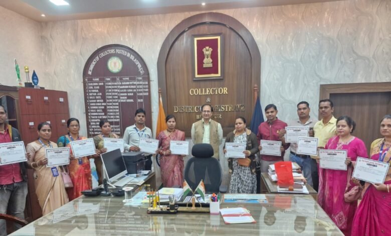 छत्तीसगढ़ बिलासपुर से भूपेंद्र साहू की रिपोर्ट/ 27 नवम्बर 2025/ मतदाता सूचियों के गहन पुनरीक्षण कार्य में मैदानी स्तर पर कार्यरत बीएलओ का कलेक्टर संजय अग्रवाल निरंतर हौसला बढ़ा रहे है। इस क्रम में उन्होंने आज फिर 30 बीएलओ एवं अभिहित अधिकारियों को प्रशस्ति पत्र देकर सम्मानित किया। जिला निर्वाचन कार्यालय से प्राप्त जानकारी के अनुसार आज सम्मानित होने वाले बीएलओ में विधानसभा क्षेत्र तखतपुर के ग्राम चनाडोंगरी की बीएलओ श्रीमती अंजू वनराजा, साल्हेकापा की मायादेवी जायसवाल, नेवसा की अनिता ठाकुर, खठोलिया की गायत्री कश्यप, गोकुलपुर की सुनीता बघेल, गनियारी की शिल्पा वैष्णव, महुआकापा के गौरीशंकर कौशिक, टिकरी की प्रगति साहू, परसाकापा रूपमणी कश्यप, मस्तुरी विधानसभा क्षेत्र के ग्राम भगवान पाली के बीएलओ हरिचंद्र वर्मा, कुकदा के बीएलओ बजरंग प्रसाद बरेठ, देवीनारायण पटेल, श्रवण कुमार देवांगन, पकरिया की हेमलता सिंह, गतौरा के मिन्टु सांडे एवं हेमलता राठौर शामिल है। इसी प्रकार बेलतरा विधानसभा क्षेत्र के ग्राम मोहतराई के बीएलओ अशोक राव, हरदीडीह के कमलेश कुमार काछी, रेलहा की विमला, कोटा विधानसभा क्षेत्र के ग्राम रानीसागर की बीएलओ त्रिवेशी सिंह ठाकुर, कसईबहरा के अजय कुमार पैकरा, बृजभान सिंह श्याम, जोगीपुर के स्नेक मरावी, नंदेश्वरी मरावी, टेंगनमुड़ा के लक्ष्मी कोरी, खैरझिटी के कृष्णाबाई बैगा, लक्ष्मीन लहरे और जगदीश सिंह पैकरा शामिल है। इन सभी बीएलओ ने मतदाता पुनरीक्षण के अंतर्गत गणना पत्रक वितरण, पत्रक भरवाने, प्राप्त फॉर्म की पूर्ण संग्रहण और उनके ऑनलाईन एंट्री जैसे महत्वपूर्ण चरणों को दक्षता और समयबद्धता के साथ शत प्रतिशत पूरा किया।