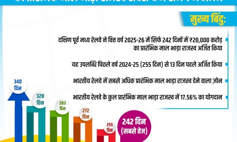 दक्षिण पूर्व मध्य रेलवे ने केवल 242 दिनों में ₹20,000 करोड़ की प्रारंभिक माल भाड़ा आय अर्जित कर अब तक की सबसे तेज़ उपलब्धि प्राप्त की है । यह मील का पत्थर आज 28 नवंबर 2025 को प्राप्त हुआ, जो कि गत वर्ष की तुलना में 13 दिन पूर्व है । गत वर्ष यह आंकड़ा 11 दिसंबर 2024 को (255 दिनों में) प्राप्त हुआ था ।