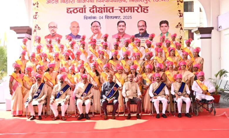 छत्तीसगढ़ बिलासपुर से भूपेंद्र साहू की रिपोर्ट/ रायपुर, 04 दिसम्बर 2025/ अटल बिहारी वाजपेयी विश्वविद्यालय बिलासपुर के छठवें दीक्षांत समारोह का आयोजन आज पूर्व राष्ट्रपति रामनाथ कोविंद के मुख्य आतिथ्य में गरिमामय वातावरण में किया गया। कार्यक्रम की अध्यक्षता राज्यपाल रमेन डेका ने की। अति विशिष्ट अतिथि के तौर पर मुख्यमंत्री विष्णु देव साय उपस्थित रहे। समारोह में 64 शोद्यार्थियों को शोध उपाधि, 92 गोल्ड मेडल एवं 36950 स्नातक एवं स्नातकोत्तर उपाधि दी गई।