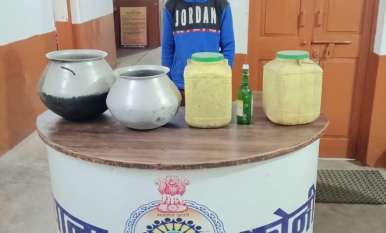 ग्राम घुटकु में ईश्वर फेकर ढीमर के पास से 31 लीटर हाथ भट्टी से निर्मित कच्ची महुवा शराब जप्त की गई है, जिसकी कीमत 6200 रुपये है। आरोपी को गिरफ्तार कर लिया गया है और उसे न्यायालय में पेश किया जाएगा।