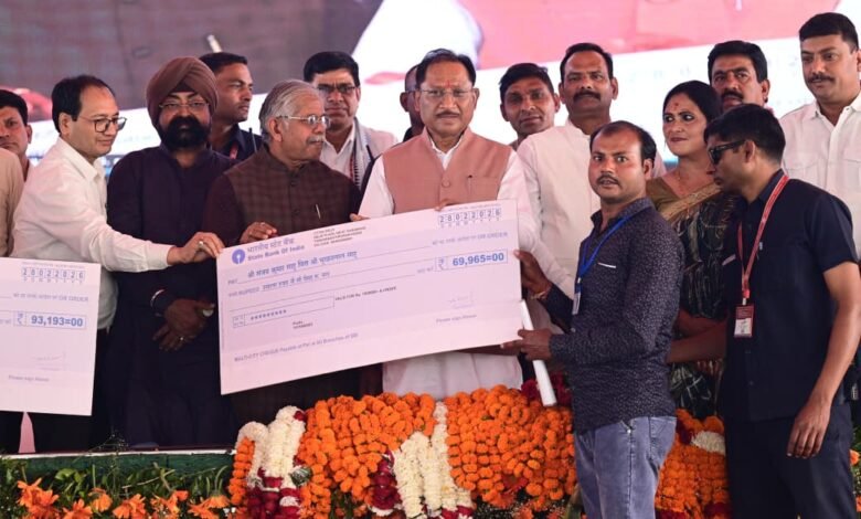 बिलासपुर, 28 फरवरी 2026/ मुख्यमंत्री विष्णु देव साय ने आज बिल्हा विकासखण्ड के ग्राम रहंगी में आयोजित राज्य स्तरीय किसान सम्मेलन में विभिन्न विभागों की जनकल्याणकारी योजनाओं के अंतर्गत हितग्राहियों को कृषि उपकरण, मोटराइज्ड ट्राइसाइकिल एवं चेक का वितरण किया। मुख्यमंत्री ने विभिन्न विभागों द्वारा लगाए गए स्टॉल का भी निरीक्षण किया। सम्मेलन में बड़ी संख्या में किसानों की उपस्थिति रही।