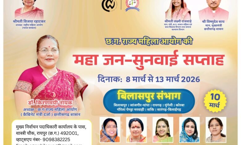 बिलासपुर l छत्तीसगढ़ राज्य महिला आयोग द्वारा महिलाओं से संबंधित शिकायतों के त्वरित निराकरण और उन्हें न्याय दिलाने के उद्देश्य से महा जन-सुनवाई सप्ताह का आयोजन किया जा रहा है। इसी क्रम में 10 मार्च 2026 को बिलासपुर संभाग स्तर पर महा जन-सुनवाई आयोजित की जाएगी।
