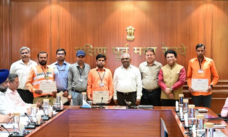 बिलासपुर, 17 मार्च, 2026 रेल परिचालन में संरक्षा दक्षिण पूर्व मध्य रेलवे की सर्वोच्च प्राथमिकता है । सजगता एवं बेहतर संरक्षा कार्य में सहभागिता निभाने वाले रेल संरक्षा के सजग प्रहरी कर्मचारियों का सम्मान महाप्रबंधक, दक्षिण पूर्व मध्य रेलवे के द्वारा हर माह आयोजित संरक्षा बैठक के दौरान किया जाता है । इसी कड़ी में आज दिनांक 17 मार्च, 2026 को दक्षिण पूर्व मध्य रेलवे में कार्यरत संरक्षा कोटि के 05 कर्मचारियो को उनके उत्कृष्ट एवं सराहनीय संरक्षा संबंधी कार्य निष्पादन के लिए महाप्रबंधक तरुण प्रकाश के द्वारा सम्मानित किया गया ।